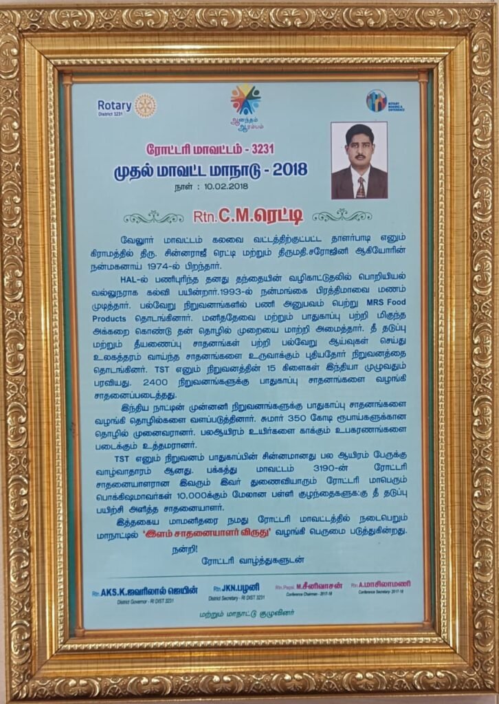 C Meganathan’s wife also Joined Rotary Jeevan Beemanagar Club, in the Year 2013, she Served as a President for the Year 2019-20, in this Period, her Club Executed 1st ICE – International Cultural Exchange Program with Rwanda and she Conducted CSR Conclave – District Program, in which Deputy Chief Minister was the Chief Guest, she also executed more than 75 Service Project in that Period, she was Awarded as Best President of the Year, she Served as AG (Assistant Governor) in the Year 2021-22, she also Served as Director for Disaster Management and Currently Serving as Director for Women in Rotary and she was Awarded as “Avenue of Service” from Rotary International